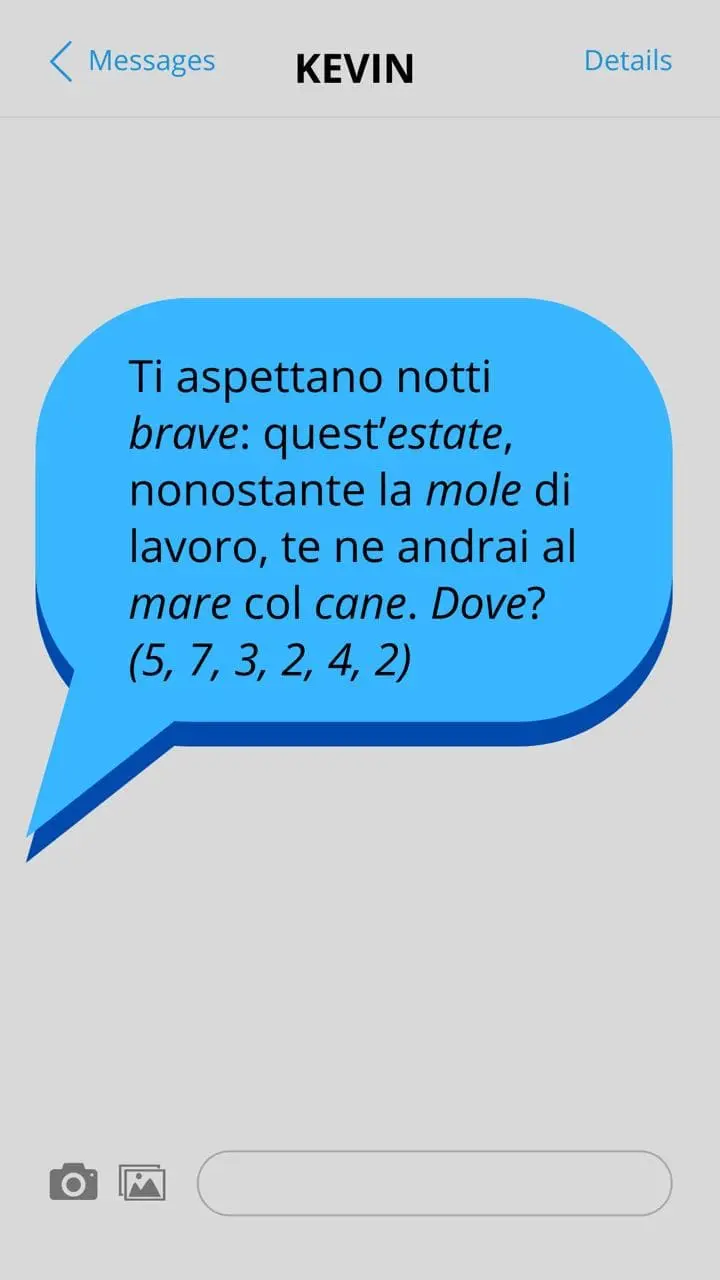 Uhm, decifrando i messaggi ho trovato tre parole… Quali tre parole? No, non sole.cuore.amore, ma quelle che, nell’ordine dei tre messaggi, mi hanno rivelato in quale località avverrà l’incontro!